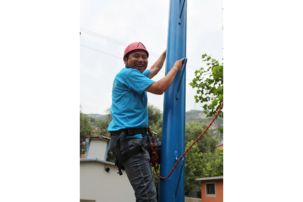 此次拓展訓練加大了難度,增加了高空斷橋項目。挑戰(zhàn)人員需自行爬上八米的立柱,從很窄的木板上走過,然后跨越到一米半以外的另一塊木板上,然后從兩塊木板中間跳下。雖然有保險繩保護,但對于參與者的心理和體力還是一個很大的挑戰(zhàn)。